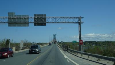 über den Miramichi River fahren, ist der Himmel strahlend blau.