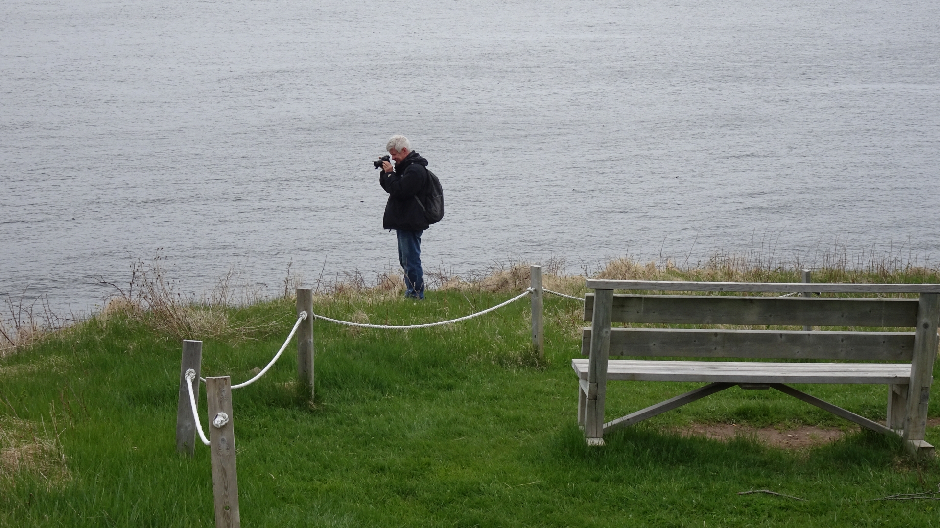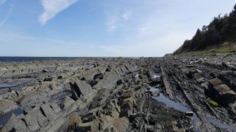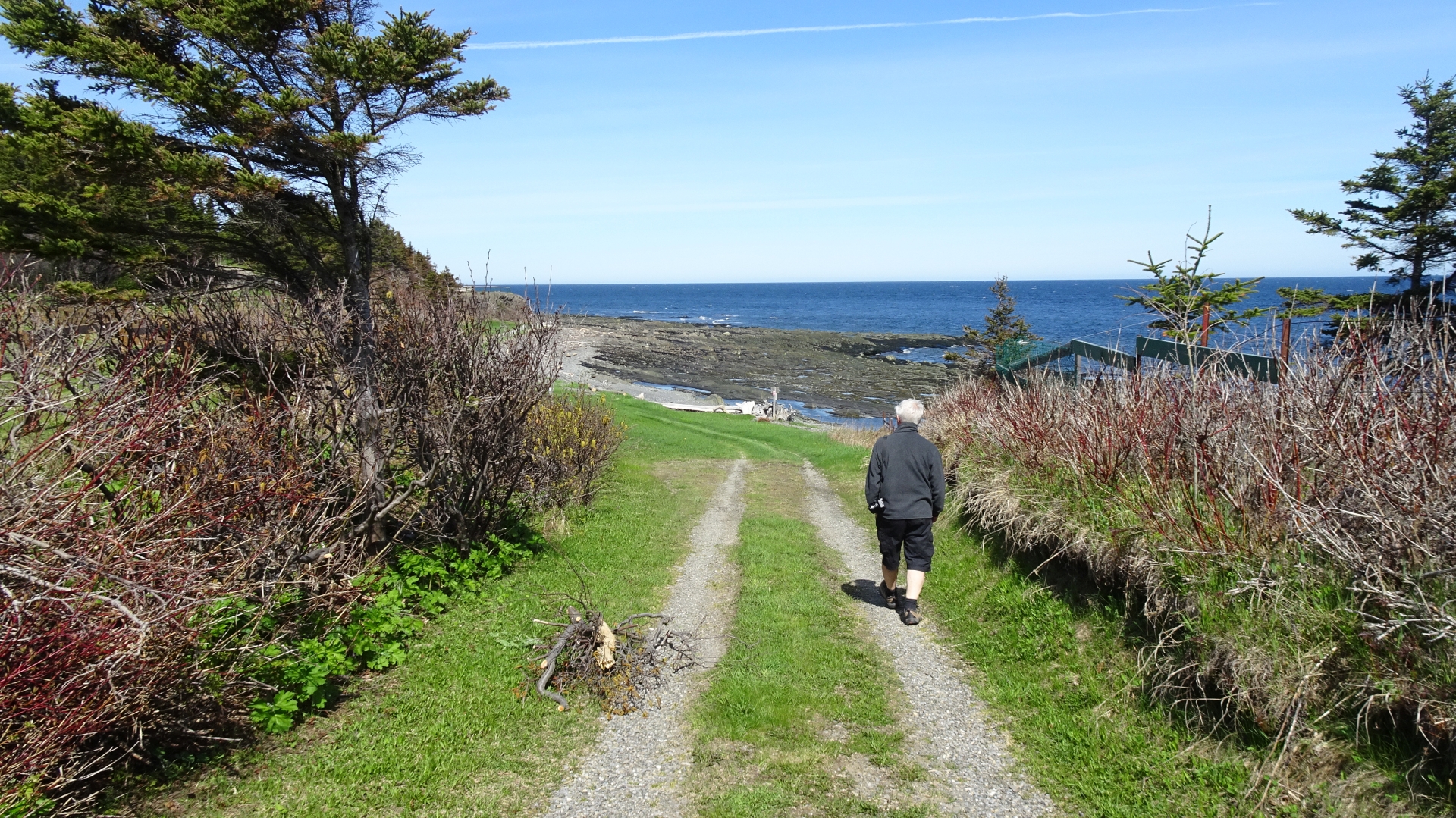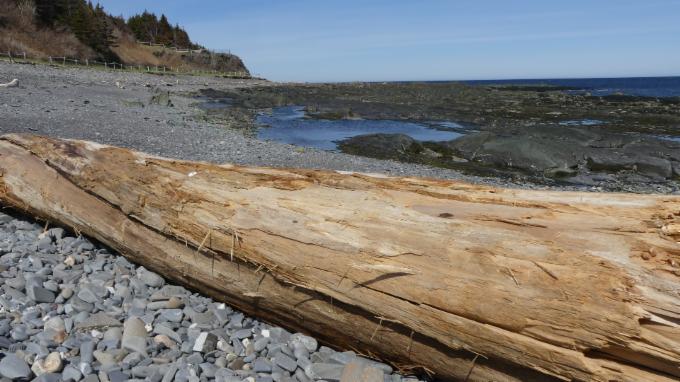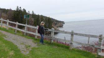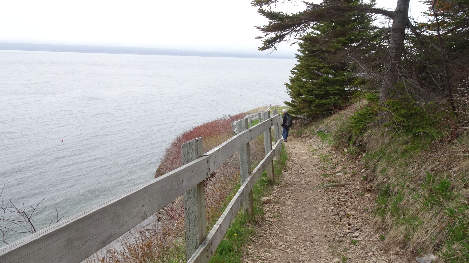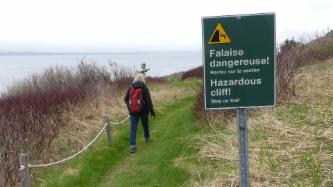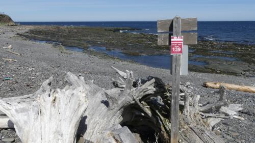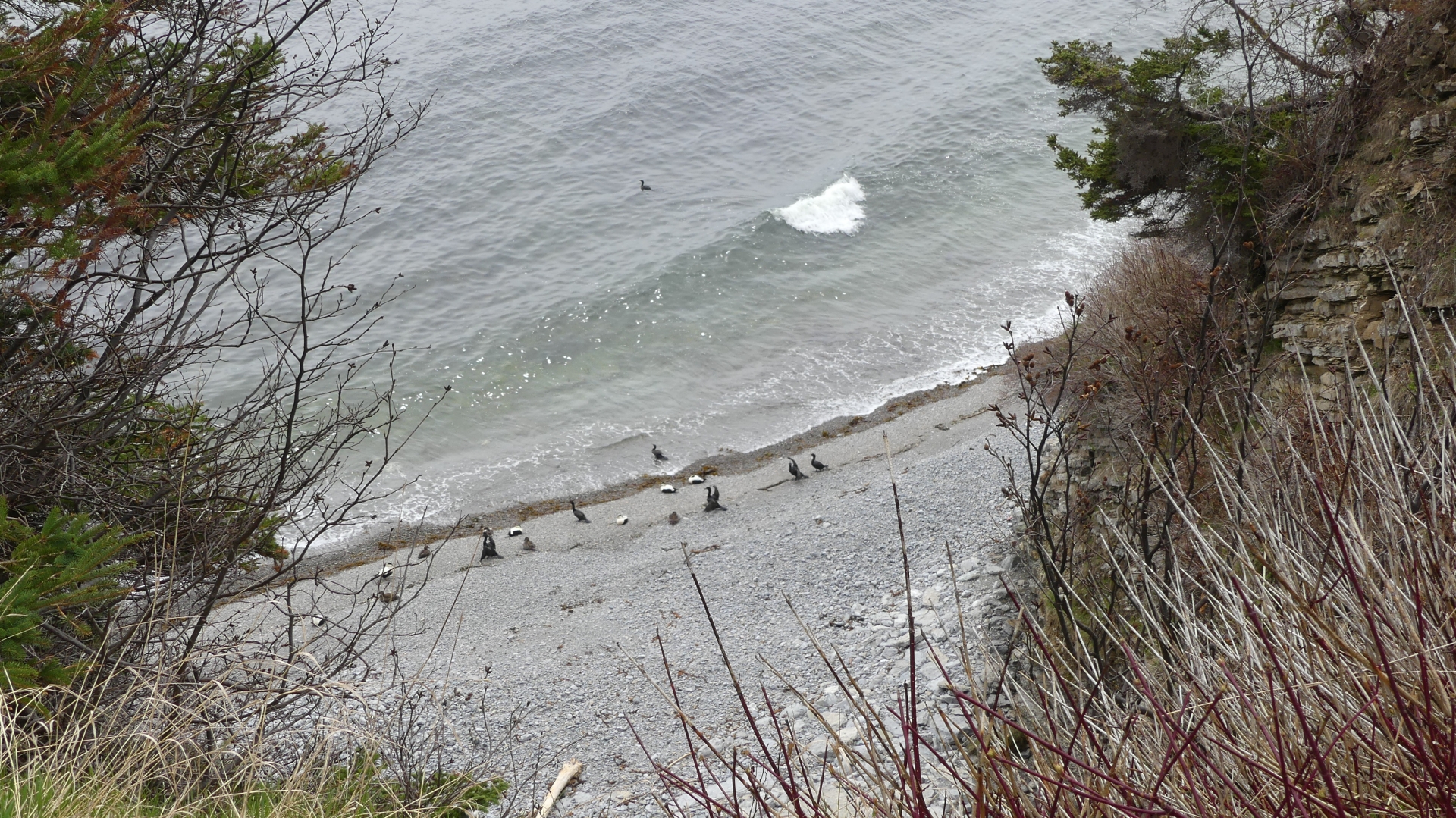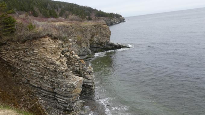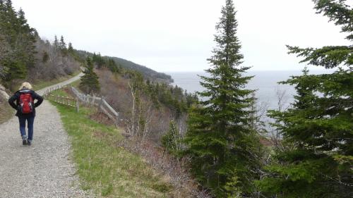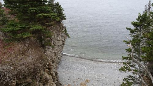 Auf dem Hinweg laufen wir oberhalb der Küste am Wald entlang, und auf dem Rückweg gehen wir am Wasser lang, am Golf von St. Lorenz.